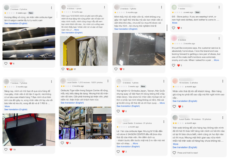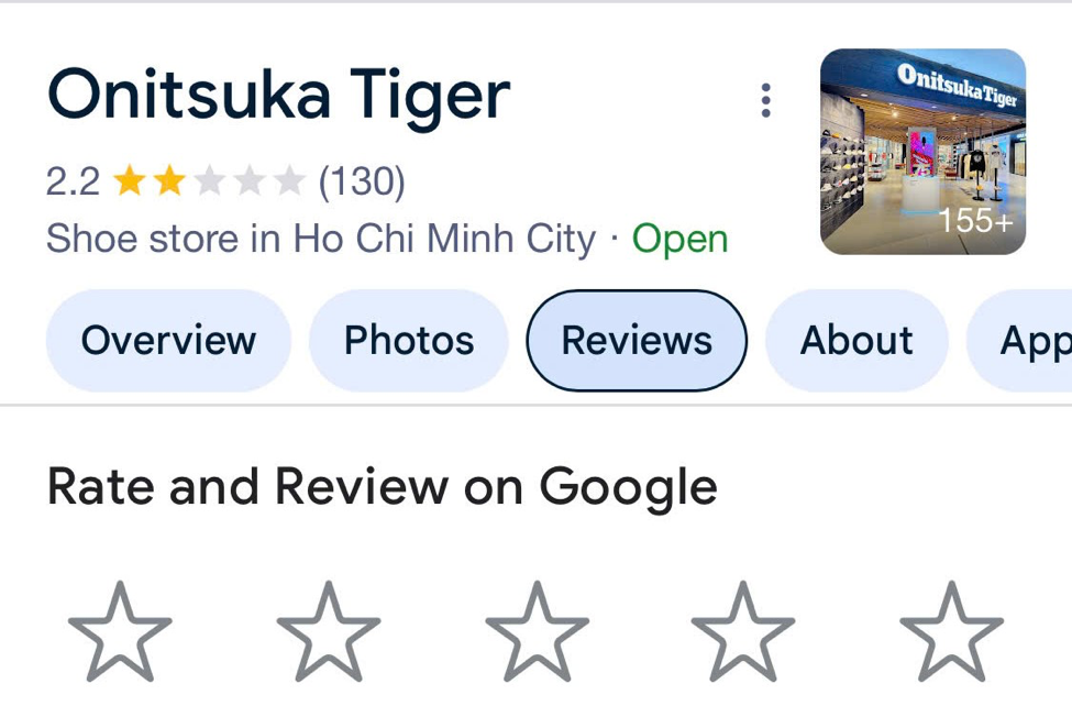 Tuy nhiên, ghi nhận thực tế trái ngược với vị thế thương hiệu, trải nghiệm mua sắm tại đây lại khiến đông đảo khách hàng cảm thấy thất vọng. Chỉ cần tìm kiếm Onitsuka Tiger Việt Nam trên Google, con số đánh giá 2,2/5 sao đã đủ khiến nhiều người giật mình. Đáng lo ngại hơn, hơn 90% bình luận là tiêu cực, phần lớn tập trung vào thái độ phục vụ thiếu chuyên nghiệp của nhân viên vì sao có lổ hổng?