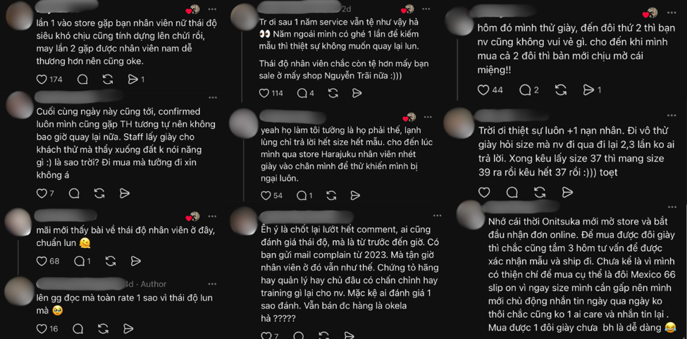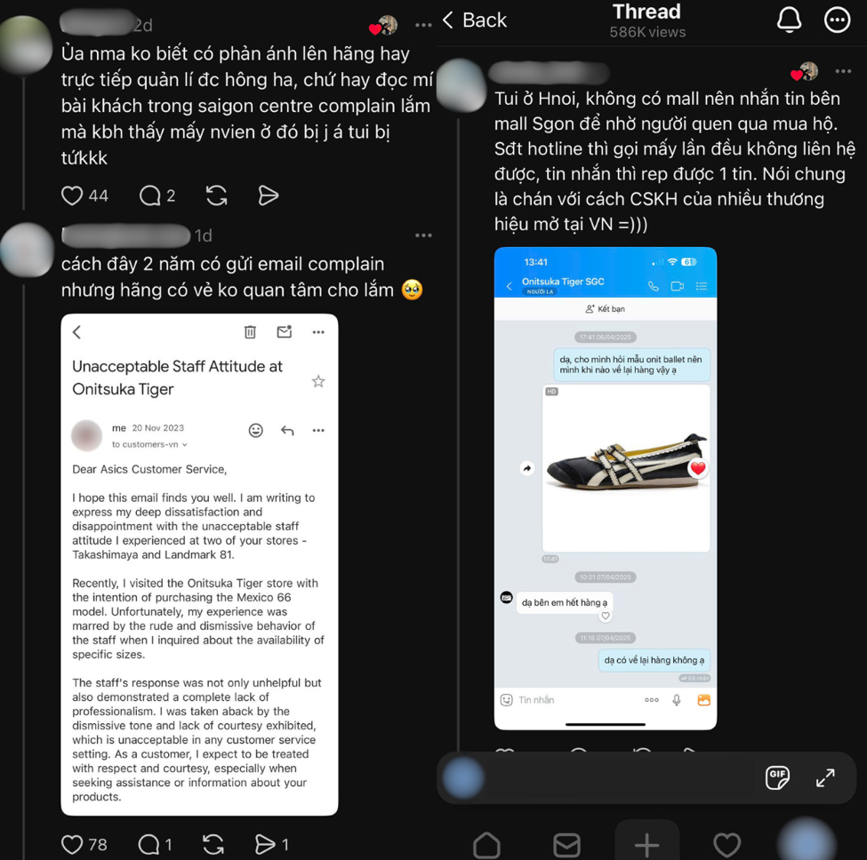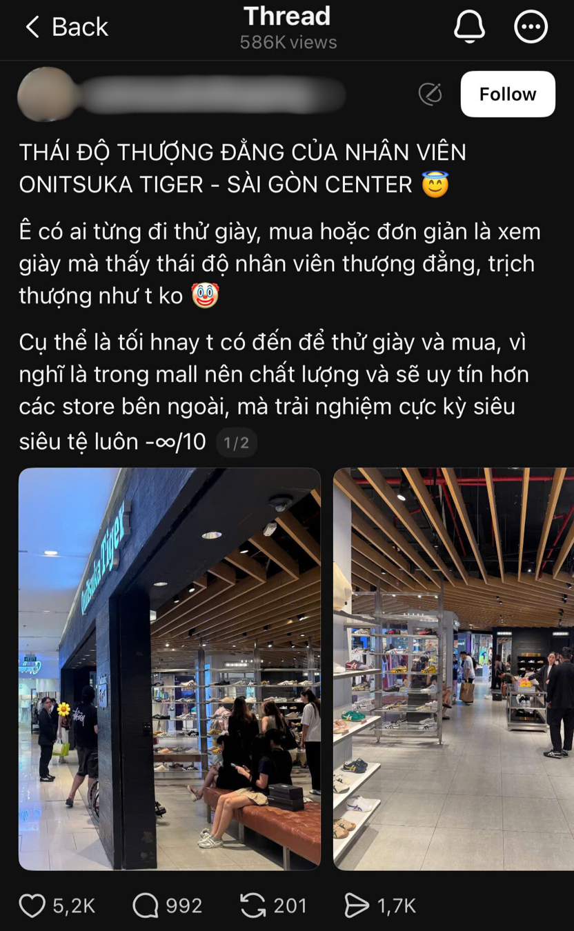 Gần đây, một bài đăng trên nền tảng Threads thu hút hơn 500.000 lượt xem và hàng nghìn bình luận, xoay quanh thái độ “thượng đẳng” của nhân viên Onitsuka Tiger tại Saigon Centre. Chủ bài viết chỉ đơn giản đặt câu hỏi: “Có ai từng trải qua trải nghiệm mua sắm tệ như tôi không?” – nhưng ngay lập tức đã “gãi đúng chỗ ngứa” của rất nhiều khách hàng.