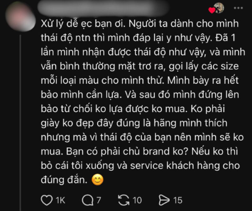 “Mình cố tình yêu cầu thử nhiều mẫu, nhiều size. Sau khi nhân viên miễn cưỡng phục vụ, mình đứng dậy nói thẳng: ‘Không phải vì giày không đẹp, mà vì thái độ của bạn nên tôi sẽ không mua. Bạn không phải chủ thương hiệu, hãy bỏ cái tôi xuống và phục vụ khách cho đúng mực’.”
